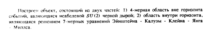 Построен объект, состоящий из двух частей: 1) 4-мерная область вне горизонта событий, являющаяся неабелепой SU(2) черной дырой; 2) область внутри горизонта, являющаяся решением 7-мерных уравнений Эйнштейна Калузы Клейна Янга Миллса.