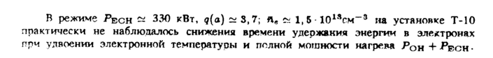 В режиме РЕсн с* 330 кВт, q(a) ~S,7; ηβ ~ 1, 5 10ascm~3 на установке Т-10 практически не наблюдалось снижения времени удержания энергии в электронах при удвоении электронной температуры и полной мошности нагрева Р0н + Pf,ch*