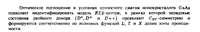 Оптическое поглощение в условиях одноосного сжатия монокристаллов GaAs позволяет индентифицировать модель £1,2-центра, в рамках которой зарядовые состояния двойного донора (D°,D+ и D-f-+) проявляют С3у -симметрию и формируются соответственно из волновых функции L, Г и X долин зоны проводимости.