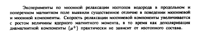 Эксперименты по мюонной релаксации изотопов водорода в продольном и поперечном магнитном поле выявили существенное отличие в поведении мюониевой и мюонной компоненты. Скорость релаксации мюониевой компоненты увеличивается с ростом величины ядерного магнитного момента, в то время как деполяризация диамагнитной компоненты (μ+) практически не зависит от изотопного состава.