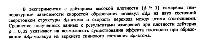 В экспериментах с дейтерием высокой плотности (ф Si 1) измерены температурные зависимости скоростей образования молекул άάμ из двух состояний сверхтонкой структуры (ίμ-атома и скорость перехода между этими состояниями. Сравнение полученных данных с результатами измерений при плотности дейтерия φ = 0,02 указывает на возможность существования эффекта плотности при образовании <Мд-молекул из верхнего спинового состояния (ίμ-атома.