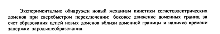 Экспериментально обнаружен новый механизм кинетики сегнетоэлектрических доменов при сверхбыстром переключении: боковое движение доменных границ за счет образования цепей новых доменов вблизи доменной границы и наличие времени задержки зародышеобразования.