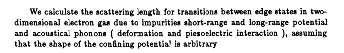 We calculate the scattering length for transitions between edge states in two-dimensional electron gas due to impurities short-range and long-range potential and acoustical phonons ( deformation and piezoelectric interaction ), assuming that the shape of the confining potential is arbitrary