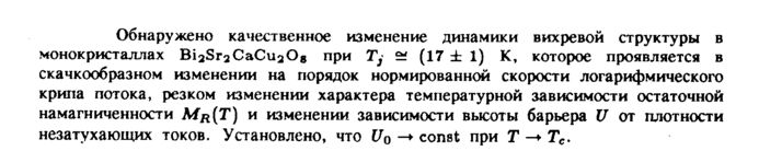 Обнаружено качественное изменение динамики вихревой структуры в монокристаллах BiaSrsCaCuaOg при Ту 5f (17 ± 1) К, которое проявляется в скачкообразном изменении на порядок нормированной скорости логарифмического крипа потока, резком изменении характера температурной зависимости остаточной намагниченности Мц(Т) и изменении зависимости высоты барьера U от плотности незатухающих токов. Установлено, что Uq —► const при Г -* Тс.