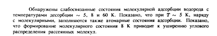 Обнаружены слабосвязанные состояния молекулярной адсорбции водорода с температурами десорбции ~ 5, 8 и 60 К. Показано, что при Τ ~ 5 К, наряду с молекулярными, заполняются также атомарные состояния адсорбции. Показано, что формирование молекулярного состояния 8 К приводит к ушпрению углового распределения рассеянных молекул.