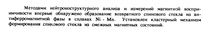 Методами нейтроноструктурного анализа и измерений магнитной восприимчивости впервые обнаружено образование возвратного спинового стекла из антиферромагнитной фазы в сплавах Ni Μη. Установлен кластерный механизм формирования спинового стекла из смежных магнитных состояний.