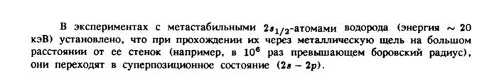 В экспериментах с метастабильными 2ах/2-атомами водорода (энергия ~ 20 кэВ) установлено, что при прохождении их через металлическую щель на большом расстоянии от ее стенок (например, в 10е раз превышающем боровский радиус), они переходят в суперпозиционное состояние (2з 2р).