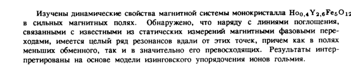 Изучены динамические свойства магнитной системы монокристалла Hoo^Ya^FesOis в сильных магнитных полях. Обнаружено, что наряду с линиями поглощения, связанными с известными из статических измерений магнитными фазовыми переходами, имеется целый ряд резонансов вдали от этих точек, причем как в полях меньших обменного, так и в значительно его превосходящих. Результаты интерпретированы на основе модели изинговского упорядочения ионов гольмия.