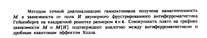Методом точной диагонализации гамильтониана получена намагниченность Μ в зависимости от поля Η двумерного фрустрированного антиферромагнетика Гейзенберга на квадратной решетке размером 4x4. Совокупность плато на графике зависимости Μ = Μ (Η) подтверждают аналогию между антиферромагнетиком и дробным квантовым эффектом Холла.