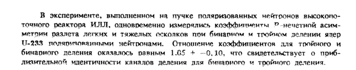 В эксперименте, выполненном на пучке поляризованных нейтронов высокопоточного реактора ИЛЛ, одновременно измерялись коэффициенты ρ-нечетной асимметрии разлета легких и тяжелых осколков пои бинаоном и тройном делении ядер U-233 поляризованными нейтоонами. Отношение коэффициентов для тгюйного и бинаоного деления оказалось равным 1.05 + —0,10.. что свидетельствует о приблизительной идентичности каналов деления для бинарного и тройного деления.
