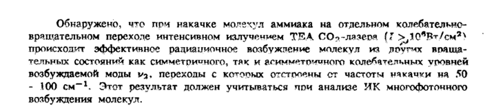 Обнаружено, что при накачке молекул аммиака на отдельном колебательно-вращательном переходе интенсивном излучением ТЕЛ СО я-лазера (i >,10вВт/см*> происходит эффективное радиационное возбуждение молекул из других вращательных состояний как симметричного, так и асимметричного колебательных уровней возбуждаемой моды переходы с которых отстроены от частоты накачки на 50 100 см-1. Этот результат должен учитываться при анализе ИК многофотонного возбуждения молекул.
