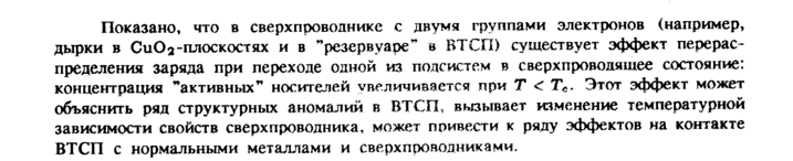 Показано, что в сверхпроводнике с двумя группами электронов (например, дырки в СиО 2-плоскостях и в "резервуаре* β ВТ СП) существует эффект перераспределения заряда при переходе одной из подсистем в сверхпроводящее состояние: концентрация "активных" носителей увеличивается при Τ <ТС. Этот эффект может объяснить ряд структурных аномалий в ВТСП, вызывает изменение температурной зависимости свойств сверхпроводника, может привести к ряду эффектов на контакте ВТСП с нормальными металлами и сверхпроводниками.