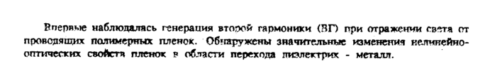 Впервъге наблюдалась генерация второй гармоники (БГ) при отражении света от проводящих полимерных пленок. Обнаружены значительные изменения нелинейно -оптических С80ЙС1Н пленок в области перехода диэлектрик металл.