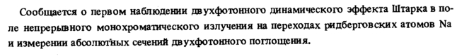 Сообщается о первом наблюдении двухфотоиного динамического эффекта Штарка в поле непрерывного монохроматического излучения на переходах ридберговских атомов Na и измерении абсолютных сечений двухфотонного поглощения.