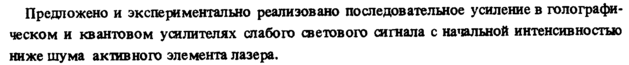 Предложено и экспериментально реализовано последовательное усиление в топографическом и квантовом усилителях слабого светового сигнала с начальной интенсивностью ниже шума активного элемента лазера.