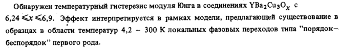 Обнаружен температурный гистерезис модуля Юнга в соединениях УВагСизОд. с 6,24 <х <6,9. Эффект интерпретируется в рамках модели, предлагающей существование в образцах в области температур 4,2 300 К локальных фазовых переходов типа "порядок-беспорядок" первого рода.