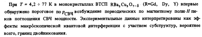 При Τ = 4,2 τ 77 К в монокристаллах ВТСП RBa2Cu307.§ (R=Gd, Dy, Υ) впервые обнаружено пороговое по РСВц возбуждение периодических по магнитному полю Я пиков поглощения СВЧ мощности. Экспериментальные данные интерпретированы как эффекты макроскопической квантовой интерференции с участием субструктур, вероятнее всего, границ двойни кования.