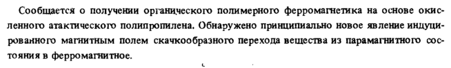 Сообщается о получении органического полимерного ферромагнетика на основе окисленного атактического полипропилена. Обнаружено принципиально новое явление индуцированного магнитным полем скачкообразного перехода вещества из парамагнитного состояния в ферромагнитное.