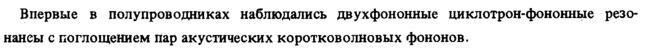 Впервые в полупроводниках наблюдались двухфононные циклотрон-фононные резо-нанеы с поглощением пар акустических коротковолновых фононов.