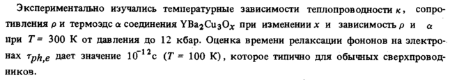 Экспериментально изучались температурные зависимости теплопроводности к» сопротивления р и термоэдс α соединения УВагСизО^ при изменении χ и зависимость р и а при Т= 300 К от давления до 12 кбар. Оценка времени релаксации фононов на электро-нах Tph e дает значение 10 с (Г 100 К), которое типично для обычных сверхпроводников.