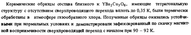 Керамические образцы состава близкого к YBa2Cu30e} имеющие тетрагональную структуру с отсутствием сверхпроводящего перехода вплоть до 0,35 К, были термически обработаны в атмосфере газообразного хлора. Полученные образцы оказались устойчивыми при нормальных условиях и демонстрировали зафиксированный по скачку магнитной восприимчивости сверхпроводящий переход с началом при 90 92 К.