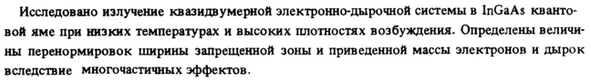 Исследовано излучение квазидв у мерной электронно-дырочной системы в InGaAs квантовой яме при низких температурах и высоких плотностях возбуждения. Определены величины перенормировок ширины запрещенной зоны и приведенной массы электронов и дырок вследствие многочастичных эффектов.