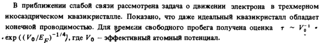В приближении слабой связи рассмотрена задача о движении электрона в трехмерном икосаэдрическом квазикристалле. Показано, что даже идеальный квазикристалл обладает конечной проводимостью. Для времени свободного пробега получена оценка τ ~ V'1 · « ехр (( V0 /EF)~1/A), где V0 эффективный атомный потенциал.