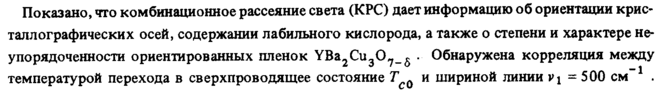Показано, что комбинационное рассеяние света (КРС) дает информацию об ориентации кристаллографических осей, содержании лабильного кислорода, а также о степени и характере неупорядоченности ориентированных пленок YBa2Cu307 § . Обнаружена корреляция между температурой перехода в сверхпроводящее состояние Τ Q и шириной линии ν χ 500 см 1 .