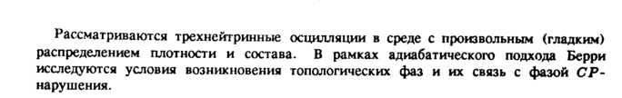 Рассматриваются трехнейтринные осцилляции в среде с произвольным (гладким) распределением плотности и состава. В рамках адиабатического подхода Берри исследуются условия возникновения топологических фаз и их связь с фазой СР-нарушения.
