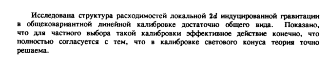 Исследована структура расходимостей локальной 2d индуцированной гравитации в общековариантной линейной калибровке достаточно общего вида. Показано, что для частного выбора такой калибровки эффективное действие конечно, что полностью согласуется с тем, что в калибровке светового конуса теория точно решаема.