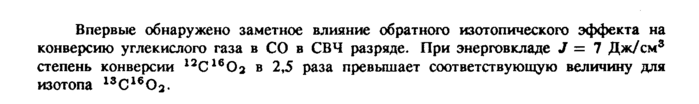 Впервые обнаружено заметное влияние обратного изотопического эффекта на конверсию углекислого газа в СО в СВЧ разряде. При энерговкладе 7=7 Дж/см3 степень конверсии 12С160з в 2,5 раза превышает соответствующую величину для изотопа 13С1602.