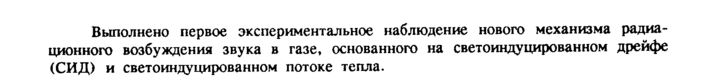 Выполнено первое экспериментальное наблюдение нового механизма радиационного возбуждения звука в газе, основанного на светоиндуцированном дрейфе (СИД) и светоиндуцированном потоке тепла.