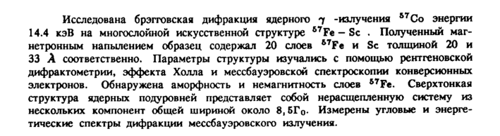 Исследована брэгговская дифракция ядерного 7 -излучения 57Со энергии 14.4 кэВ на многослойной искусственной структуре 67Fe Sc . Полученный маг-нетронным напылением образец содержал 20 слоев 67Fe и Sc толщиной 20 и 33 Л соответственно. Параметры структуры изучались с помощью рентгеновской дифрактометрии, эффекта Холла и мессбауэровской спектроскопии конверсионных электронов. Обнаружена аморфность и немагнитность слоев 67Fe. Сверхтонкая структура ядерных подуровней представляет собой нерасщепленную систему из нескольких компонент общей шириной около 8,5Г0. Измерены угловые и энергетические спектры дифракции мессбауэровского излучения.