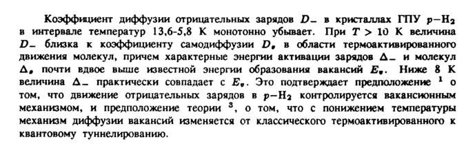 Коэффициент диффузии отрицательных зарядов Dв кристаллах ГПУ р-Н2 в интервале температур 13,6-5,8 К монотонно убывает. При Г > 10 К величина Dблизка к коэффициенту самодиффузии D, в области термоактивированного движения молекул, причем характерные энергии активации зарядов Δ_ и молекул Δ» почти вдвое выше известной энергии образования вакансий Еш. Ниже 8 К величина Δ_ практически совпадает с Е,. Это подтверждает предположение 1 о том, что движение отрицательных зарядов в p-Hj контролируется вакансионным механизмом, и предположение теории 3, о том, что с понижением температуры механизм диффузии вакансий изменяется от классического термоактивированного к квантовому туннелированию.