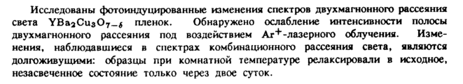 Исследованы фотоиндуцированные изменения спектров двухмагнонного рассеяния света УВа2Сиз07_< пленок. Обнаружено ослабление интенсивности полосы двухмагнонного рассеяния под воздействием Аг+-лазерного облучения. Изменения, наблюдавшиеся в спектрах комбинационного рассеяния света, являются долгоживущими: образцы при комнатной температуре релаксировали в исходное, незасвеченное состояние только через двое суток.