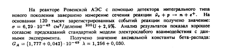 На реакторе Ровенской АЭС с помощью детектора интегрального типа нового поколения завершено измерение сечения реакции vt -+■ ρ —► η + е+. На основании 120 тысяч зарегистрированных событий реакции получено значение: σ = 6,29 · ю~43 см2/деление 23δυ + 2,9%. Анализ результатов показал хорошее согласие предсказаний стандартной модели электрослабого взаимодействия с данными эксперимента. Получено значение аксиальной константы бета-распада: GA = (1, 777 + 0,042) · ΙΟ"49 λ = 1,256 + 0,030.