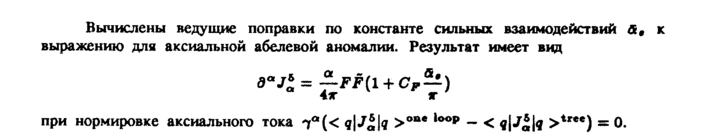 Вычислены ведущие поправки по константе сильных взаимодействий а» к выражению для аксиальной абелевой аномалии. Результат имеет вид при нормировке аксиального тока ча(< >°tt* loop ~ < flWifl >tree) = 0.
