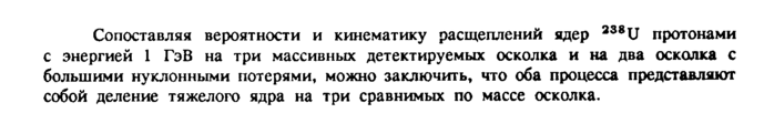 Сопоставляя вероятности и кинематику расщеплений ядер 238 U протонами с энергией 1 ГэВ на три массивных детектируемых осколка и на два осколка с большими нуклонными потерями, можно заключить, что оба процесса представляют собой деление тяжелого ядра на три сравнимых по массе осколка.