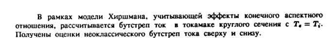 В рамках модели Хиршмана, учитывающей эффекты конечного аспектного отношения, рассчитывается бутстреп ток в токамаке круглого сечения с Тл = Τ,·. Получены оценки неоклассического бутстреп тока сверху и снизу.