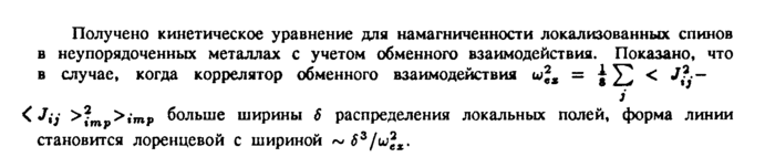 Получено кинетическое уравнение для намагниченности локализованных спинов в неупорядоченных металлах с учетом обменного взаимодействия. Показано, что в случае, когда коррелятор обменного взаимодействия ш*ж = $ Σ ^ з К. J{j >?m >imp больше ширины 6 распределения локальных полей, форма линии становится лоренцевой с шириной ~ δ3/ω*χ.