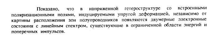 Показано, что в напряженной гетероструктуре со встроенными поляризационными полями, индуцируемыми упругой деформацией, независимо от картины расположения зон полупроводников появляются двумерные электронные состояния с линейным спектром, существующие в ограниченной области энергий и поперечных импульсов.