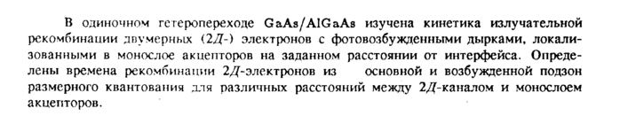 В одиночном гетеропереходе GaAs/AlGaAs изучена кинетика излучательной рекомбинации двумерных (2Д-) электронов с фотовозбужденными дырками, локализованными в монослое акцепторов на заданном расстоянии от интерфейса. Определены времена рекомбинации 2Д~электронов из основной и возбужденной подзон размерного квантования для различных расстояний между 2Д-каналом и монослоем акцепторов.