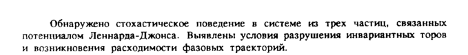 Обнаружено стохастическое поведение в системе из трех частиц, связанных потенциалом Леннарда-Джонса. Выявлены условия разрушения инвариантных торов и возникновения расходимости фазовых траекторий.