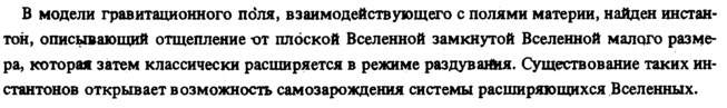 В модели гравитационного поля, взаимодействующего с полями материи, найден инстан-тон, описывающий отщепление х>т плоской Вселенной замкнутой Вселенной Manqro размера, которая затем классически расширяется в режиме раздувания. Существование таких ин-стантонов открывает возможность самозарождения системы расширяющихся Вселенных.