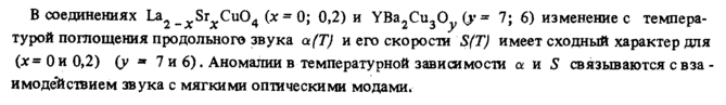 В соединениях La2 _х^хСиО^ (χ = 0; 0,2) и YBa2Cu3Oy (у 7; 6) изменение с температурой поглощения продольного звука а(Т) и его скорости имеет сходный характер для (х= 0 и 0,2) (у * 7 и 6). Аномалии в температурной зависимости а и S связываются свза -имодействием звука с мягкими оптическими модами.