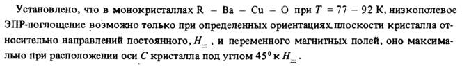 Установлено, что в монокристаллах R Ва Си О при Τ = 77 92 К, низкопоттевое ЭПР-поглощение возможно только при определенных ориентациях.плоскости кристалла относительно направлений постоянного, #„ , и переменного магнитных полей, оно максимально при расположении оси С кристалла под углом 45° к #_ .