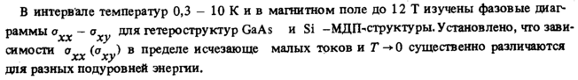 В интервале температур 0,3 10 К и в магнитном поле до 12 Τ изучены фазовые диаграммы о σ для ге те ро структур GaAs и Si -МДГЬструктуры, Установлено, что зав исимости о (σ ) в пределе исчезающе малых токов и Г-»0 существенно различаются хх %У для разных подуровней энергии.