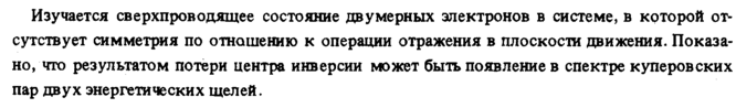Изучается сверхпроводящее состояние двумерных электронов в системе, в которой отсутствует симметрия по отношению к операции отражения в плоскости движения. Показано, что результатом потери центра инверсии может быть появление в спектре куперовских пар двух энергетических щелей.