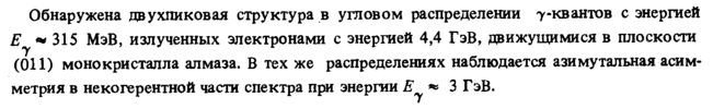Обнаружена двухпиковая структура в угловом распределении 7-квантов с энергией Ε «* 315 МэВ, излученных электронами с энергией 4,4 ГэВ, движущимися в плоскости (011) монокристалла алмаза. В тех же распределениях наблюдается азимутальная асимметрия в некогерентной части спектра при энергии Ε * 3 ГэВ.