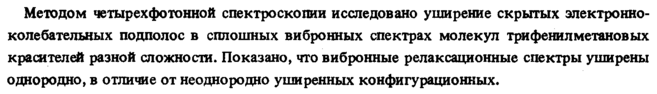 Методом четырехфотонной спектроскопии исследовано уширение скрытых электронно-колебательных подполос в сплошных вибронных спектрах молекул три фенил метановых красителей разной сложности. Показано, что вибронные релаксационные спектры уширены однородно, в отличие от неоднородно уширенных конфигурационных.